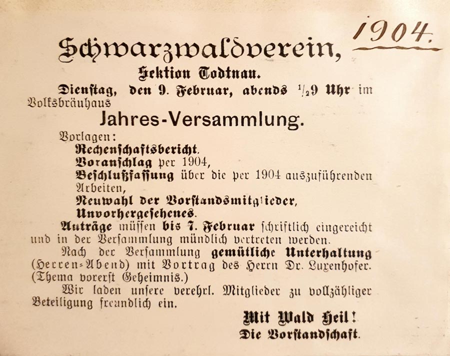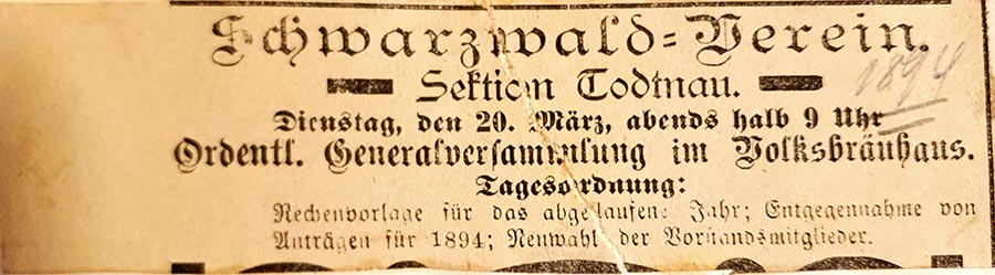 Der Schwarzwaldverein Todtnau wurde im Jahre 1887 gegründet. Schon bald nach der Gründung begann der Ortsverein Todtnau mit der Erschließung unserer Heimat für den Wanderer durch den Bau von Wanderwegen sowie deren stets damit verbundener einheitlicher Markierung. Bereits 1890/93 wurde der Weg rechts der katholischen Stadtkirche über die „Hoh“ zum prächtigen Todtnauer Wasserfall erstellt, ein Jahr später auf Aftersteger Seite die Verbindung zur Landstraße und schließlich auch durch den „Lägerwald“ mit Straßenanschluss unterhalb von Muggenbrunn. Es folgten der Hebelweg (inklusive 11 Brücken) durch das Fahler Loch zur Passhöhe Feldberg-Hebelhof (1899), sowie der Bau vieler weiterer Wege und Brücken.
